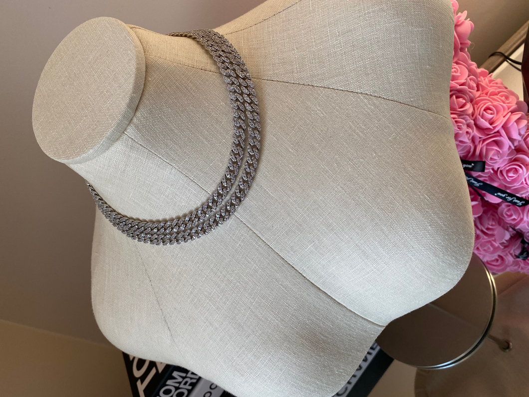 Made to lay choker length, this beautiful iced-out curb link necklace is perfect for layering up with other long chains and pendants for a highly accessorized style.