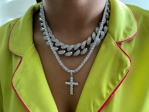 Cuban Link + Iced Cross Pendant & Tennis Necklace Set